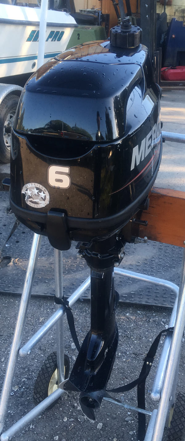 This is a 2016(mfg. date 2014 new in 2016) 6 hp Mercury 4 stroke outboard boat motor for sale. This engine has a 15" shaft and weighs about 55lbs. There is an internal gas tank and the ability to switch it to an external gas tank. We have fully tested this engine and it runs great. This 6 hp Mercury has very low hours. The 6 hp Mercury is ideal for any small inflatable, canoe, skiff, jon boat, tender, small sailboat, or any boat that is rated for a 6hp outboard.