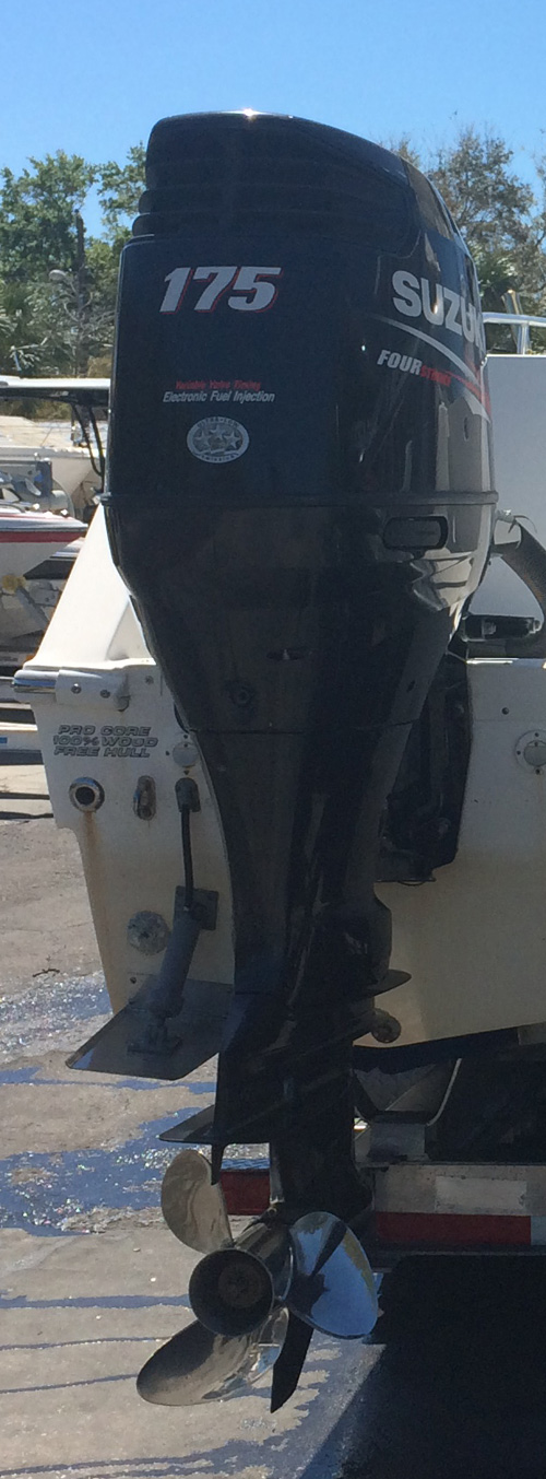 This is a 175 hp 4-Stroke Suzuki outboard boat motor for sale. This engine has around 685 hours on it. This engine has a 25" shaft, power tilt and trim, and weighs around 475lbs. We have fully boat tested this motor and it is ready to run. Compression dry is around 150-160psi even. This motor has a standard rotation gear case. It was part of a pair of motors on the back of an offshore boat. These are very desirable engines as they will accommodate most 20-22ft center console boats. There is an extended factory warranty that is still in effect on this motor. It expires in May of 2018.