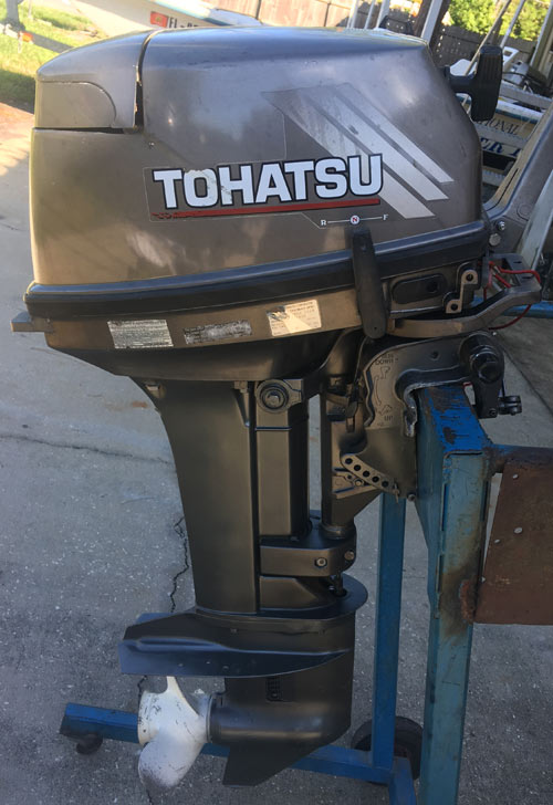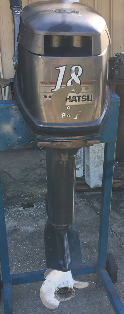 This is an 18 hp Tohatsu Outboard boat motor for sale. This engine is a 2-stroke which only weighs around 85lbs. We have fully boat tested this motor and it is ready to run. Compression is strong and even on this motor. These are very desirable outboard boat motors because of the power to weight ratio. These engines weigh the same as a 9.9 hp 4-stroke but have the power of a 20 hp engine. This motor has a 15" short shaft, tiller handle, manual start, and forward-Neutral-Reverse gear shifting. This 18 hp Tohatsu would make a great engine for the following boats: Jon boats, carolina skiff style boats, boston whalers, dinghy, inflatable, fishing boats, bass boats, use it as a kicker or on any vessel that can handle an 18 hp 2-stroke outboard engine.
